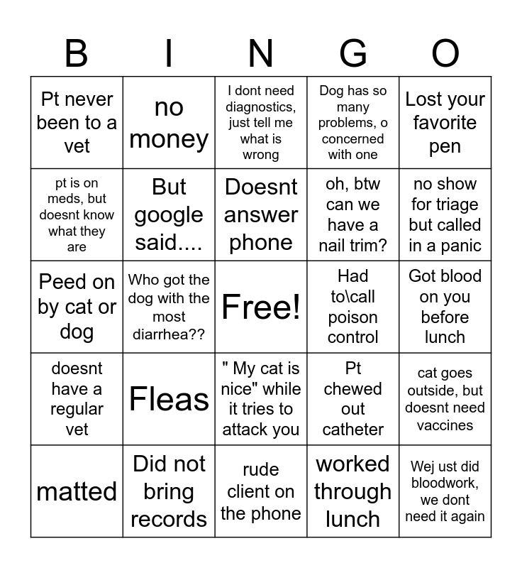 This bingo card has a free space and 24 words: Fleas, Did not bring records, Doesnt answer phone, matted, Lost your favorite pen, Pt never been to a vet, pt is on meds, but doesnt know what they are, no money, Had to\call poison control, " My cat is nice" while it tries to attack you, oh, btw can we have a nail trim?, Peed on by cat or dog, Pt chewed out catheter, cat goes outside, but doesnt need vaccines, But google said...., worked through lunch, Got blood on you before lunch, I dont need diagnostics, just tell me what is wrong, no show for triage but called in a panic, Who got the dog with the most diarrhea??, Wej ust did bloodwork, we dont need it again, doesnt have a regular vet, Dog has so many problems, o concerned with one and rude client on the phone.