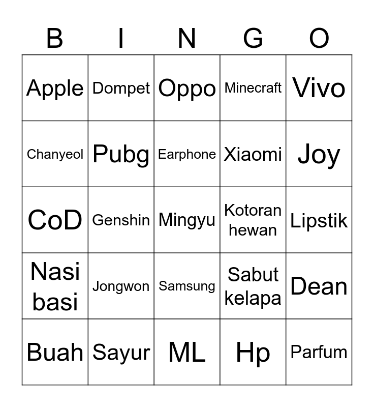 This bingo card has a free space and 24 words: Jongwon, Sayur, Earphone, Buah, Vivo, Apple, Chanyeol, Dompet, Kotoran hewan, Samsung, Xiaomi, CoD, Sabut kelapa, Dean, Pubg, Hp, Lipstik, Oppo, Joy, Genshin, Parfum, Nasi basi, Minecraft and ML.