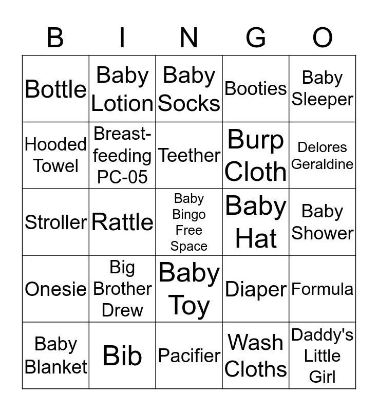 This bingo card has a free space and 24 words: Big Brother Drew, Bib, Teether, Baby Blanket, Baby Sleeper, Bottle, Hooded Towel, Baby Lotion, Baby Hat, Baby Toy, Burp Cloth, Stroller, Diaper, Formula, Breast- feeding PC-05, Wash Cloths, Baby Shower, Baby Socks, Delores Geraldine, Rattle, Daddy's Little Girl, Onesie, Booties and Pacifier.