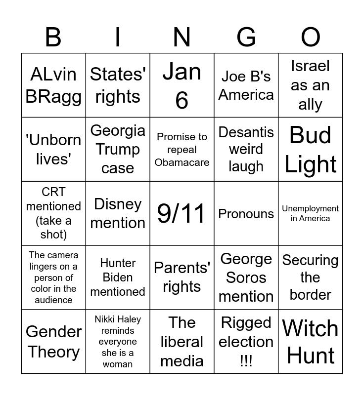 This bingo card has a free space and 24 words: Hunter Biden mentioned, Nikki Haley reminds everyone she is a woman, Promise to repeal Obamacare, Gender Theory, Israel as an ally, ALvin BRagg, 'Unborn lives', States' rights, Pronouns, Parents' rights, Desantis weird laugh, CRT mentioned (take a shot), George Soros mention, Securing the border, Georgia Trump case, Rigged election !!!, Unemployment in America, Jan 6, Bud Light, Disney mention, Witch Hunt, The camera lingers on a person of color in the audience, Joe B's America and The liberal media.