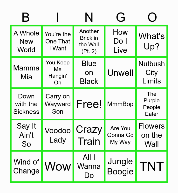 This bingo card has a free space and 24 words: Voodoo Lady, Wow, Blue on Black, Wind of Change, What's Up?, A Whole New World, Mamma Mia, You're the One That I Want, MmmBop, Crazy Train, Unwell, Down with the Sickness, Are You Gonna Go My Way, Flowers on the Wall, You Keep Me Hangin' On, Jungle Boogie, The Purple People Eater, Another Brick in the Wall (Pt. 2), Nutbush City Limits, Carry on Wayward Son, TNT, Say It Ain't So, How Do I Live and All I Wanna Do.