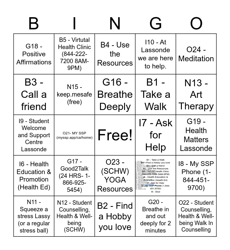 This bingo card has 2 images, a free space and 27 words: B1 - Take a Walk B2 - Find a Hobby you love B3 - Call a friend B4 - Use the Resources B5 - Virtutal Health Clinic (844-222-7200 8AM-9PM) I6 - Health Education & Promotion (Health Ed) I7 - Ask for Help I8 - My SSP Phone (1-844-451-9700) I9 - Stud, B1 - Take a Walk B2 - Find a Hobby you love B3 - Call a friend B4 - Use the Resources B5 - Virtutal Health Clinic (844-222-7200 8AM-9PM) I6 - Health Education & Promotion (Health Ed) I7 - Ask for Help I8 - My SSP Phone (1-844-451-9700) I9 - Stud, B1 - Take a Walk, B2 - Find a Hobby you love, B3 - Call a friend, B4 - Use the Resources, B5 - Virtutal Health Clinic (844-222-7200 8AM-9PM), I6 - Health Education & Promotion (Health Ed), I7 - Ask for Help, I8 - My SSP Phone (1-844-451-9700), I9 - Student Welcome and Support Centre Lassonde, I10 - At Lassonde we are here to help., N11 - Squeeze a stress Lassy (or a regular stress ball), N12 - Student Counselling, Health & Well-being (SCHW), N13 - Art Therapy, N14 - Enjoy nature, N15 - keep.mesafe (free), G16 - Breathe Deeply, G17 - Good2Talk (24 HRS- 1-866-925-5454), G18 - Positive Affirmations, G19 - Health Matters Lassonde, G20 - Breathe in and out deeply for 2 minutes, O21- MY SSP (myssp.app/ca/home), O22 - Student Counselling, Health & Well-being Walk In Counselling, O23 - (SCHW) YOGA Resources, O24 - Meditation and O25 - Gratitude Journalling.