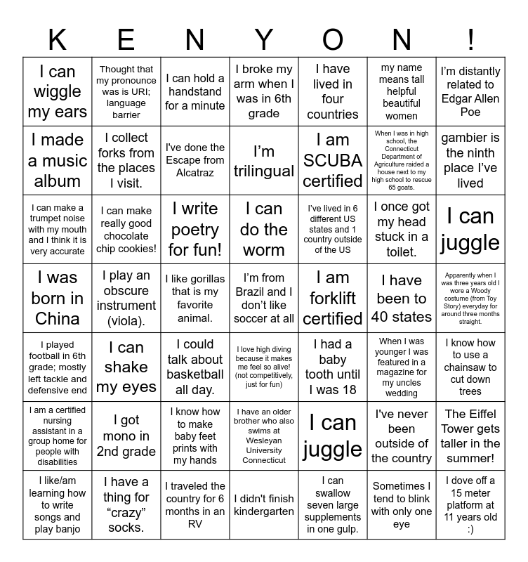 This bingo card has 65 words: I am an EMT, I played football in 6th grade; mostly left tackle and defensive end, All of my pets are named after pools I've swam in, I once got my head stuck in a toilet., I am forklift certified, I have a thing for “crazy” socks., Thought that my pronounce was is URI; language barrier, I met the man who invented the heimlich maneuver, I made a music album, I traveled the country for 6 months in an RV, I can do the worm, I've never been outside of the country, I can make a trumpet noise with my mouth and I think it is very accurate, I have lived in four countries, I do drone photography!, my name means tall helpful beautiful women, I am SCUBA certified, I can wiggle my ears, I can sing opera!, I collect forks from the places I visit., I write poetry for fun!, I can make really good chocolate chip cookies!, I broke my arm when I was in 6th grade, I could talk about basketball all day., I can twerk in every possible position, I know how to use a chainsaw to cut down trees, I had a baby tooth until I was 18, I was able to train my cat to do laundry with me!, When I was in high school, the Connecticut Department of Agriculture raided a house next to my high school to rescue 65 goats., I got mono in 2nd grade, I can juggle, I can juggle, I am a Luger, I’ve watched grays anatomy full through multiple times, I’ve lived in 6 different US states and 1 country outside of the US, I was born in China, The Eiffel Tower gets taller in the summer!, I’m trilingual, I like gorillas that is my favorite animal., I am a certified nursing assistant in a group home for people with disabilities, I’m distantly related to Edgar Allen Poe, I have been to 40 states, gambier is the ninth place I’ve lived, I am an only child, I didn't finish kindergarten, I love high diving because it makes me feel so alive! (not competitively, just for fun), I've done the Escape from Alcatraz, I like/am learning how to write songs and play banjo, I’m from Brazil and I don’t like soccer at all, Apparently when I was three years old I wore a Woody costume (from Toy Story) everyday for around three months straight., I can swallow seven large supplements in one gulp., I dove off a 15 meter platform at 11 years old :), My parents play Pickleball with Michael Keaton's brother, I play an obscure instrument (viola)., I lived in Singapore for a year when I was younger, I’ve been to Gary, Indiana., I have an older brother who also swims at Wesleyan University Connecticut, I can hold a handstand for a minute, I can shake my eyes, When I was younger I was featured in a magazine for my uncles wedding, I know how to make baby feet prints with my hands, I had a giant water bug named Mate growing up!, I had scoliosis surgery when I was 12, Sometimes I tend to blink with only one eye and Hulk Hogan and I sat next each other at Sushi restaurant in Tokyo..