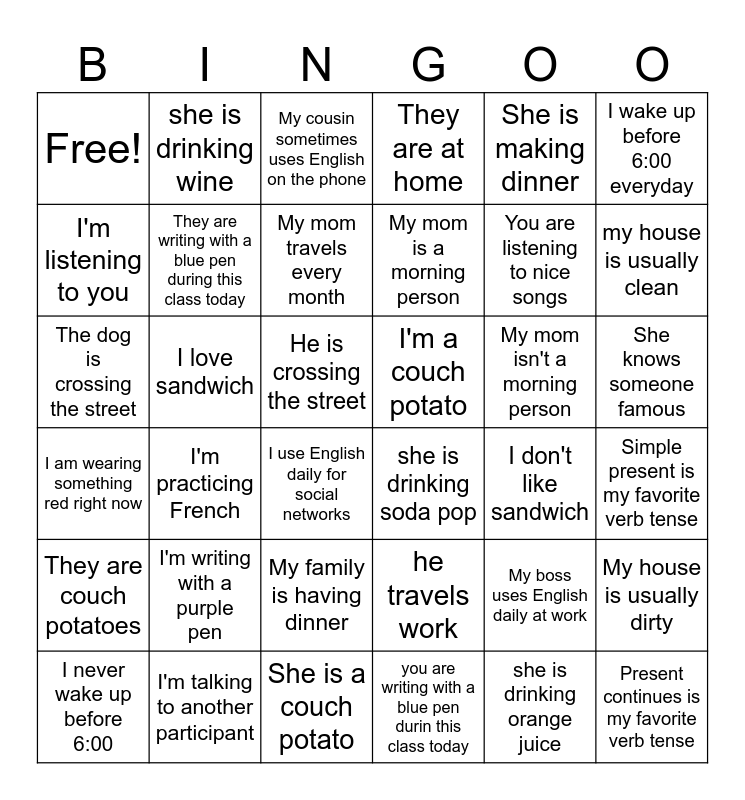 This bingo card has 36 words: I am wearing something red right now, I'm practicing French, She is a couch potato, My mom is a morning person, My mom isn't a morning person, She knows someone famous, Free!, I'm talking to another participant, My cousin sometimes uses English on the phone, he travels work, You are listening to nice songs, I wake up before 6:00 everyday, They are couch potatoes, I love sandwich, My mom travels every month, They are at home, My boss uses English daily at work, Simple present is my favorite verb tense, I'm listening to you, They are writing with a blue pen during this class today, I use English daily for social networks, she is drinking soda pop, I don't like sandwich, My house is usually dirty, The dog is crossing the street, she is drinking wine, He is crossing the street, you are writing with a blue pen durin this class today, She is making dinner, my house is usually clean, I never wake up before 6:00, I'm writing with a purple pen, My family is having dinner, I'm a couch potato, she is drinking orange juice and Present continues is my favorite verb tense.
