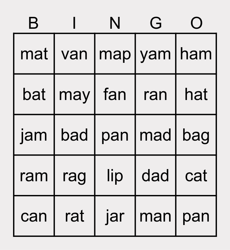 This bingo card has a free space and 24 words: can, rag, fan, man, ham, mat, van, map, mad, bag, jam, may, dad, cat, bat, rat, jar, yam, hat, ram, bad, lip, ran and pan.