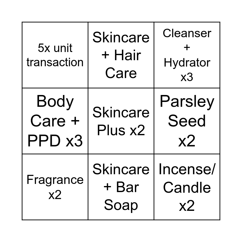 This bingo card has a free space and 8 words: Parsley Seed x2, Cleanser + Hydrator x3, Skincare + Hair Care, Fragrance x2, 5x unit transaction, Incense/ Candle x2, Body Care + PPD x3 and Skincare + Bar Soap.