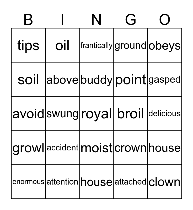 This bingo card has a free space and 24 words: accident, attention, buddy, enormous, obeys, tips, soil, oil, broil, moist, point, avoid, crown, house, above, attached, delicious, frantically, gasped, swung, clown, growl, ground and house.