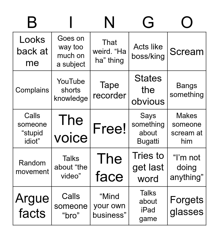This bingo card has a free space and 29 words: Argue facts, Argue opinions, The voice, Baby talk, Looks back at me, That weird. “Ha ha” thing, YouTube shorts knowledge, Talks about “the video”, Says something about Bugatti, Calls someone “bro”, Makes someone scream at him, Forgets glasses, “Mind your own business”, Talks about iPad game, Bangs something, Random noise, The face, Random movement, Scream, Calls someone “stupid idiot”, Tries to get last word, “No you”, States the obvious, Complains, Acts like boss/king, Goes on way too much on a subject, “I’m not doing anything”, Tape recorder and Cuts off sentences.