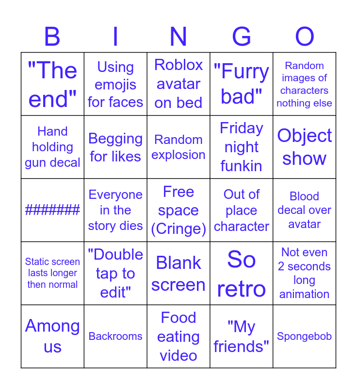 This bingo card has a free space and 24 words: "Double tap to edit", Backrooms, Random explosion, Among us, Random images of characters nothing else, "The end", Hand holding gun decal, Using emojis for faces, Out of place character, Blank screen, Friday night funkin, #######, So retro, Not even 2 seconds long animation, Begging for likes, "My friends", Blood decal over avatar, Roblox avatar on bed, Object show, Everyone in the story dies, Spongebob, Static screen lasts longer then normal, "Furry bad" and Food eating video.