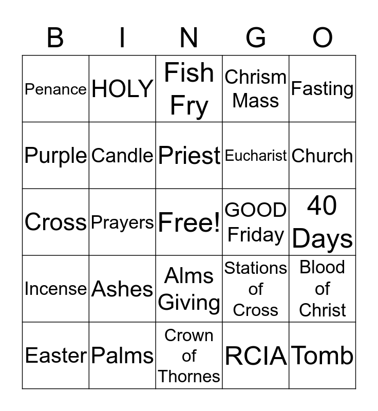 This bingo card has a free space and 24 words: Ashes, Palms, Priest, Easter, Fasting, Penance, Purple, HOLY, GOOD Friday, Alms Giving, Eucharist, Cross, Stations of Cross, Blood of Christ, Candle, RCIA, 40 Days, Fish Fry, Church, Prayers, Tomb, Incense, Chrism Mass and Crown of Thornes.