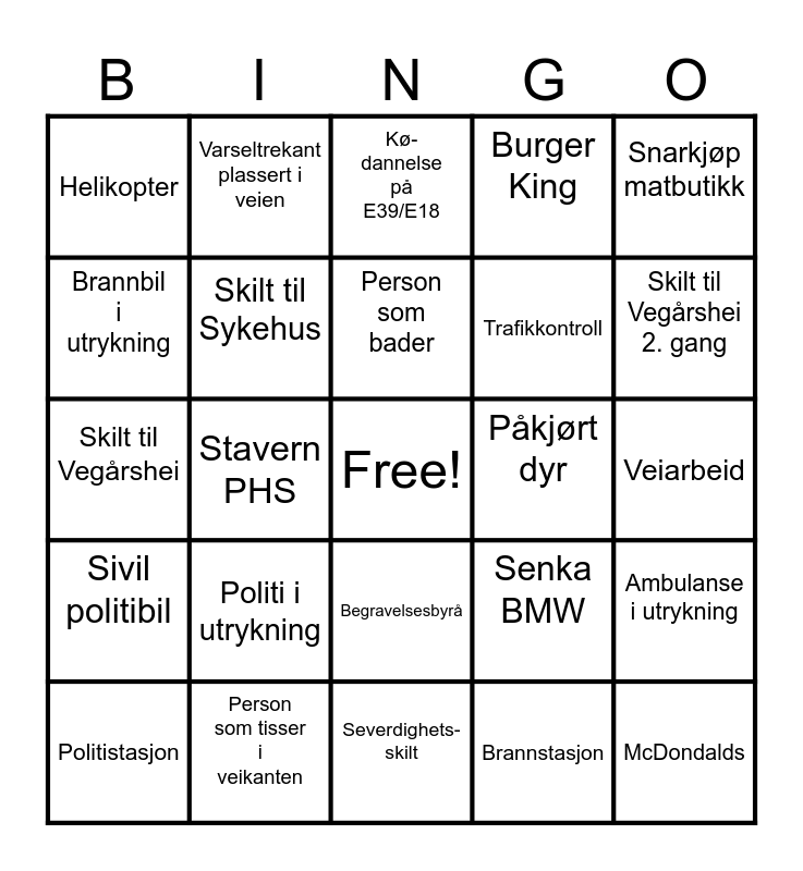 This bingo card has a free space and 24 words: Politi i utrykning, Person som tisser i veikanten, Person som bader, Politistasjon, Snarkjøp matbutikk, Helikopter, Brannbil i utrykning, Varseltrekant plassert i veien, Påkjørt dyr, Begravelsesbyrå, Trafikkontroll, Skilt til Vegårshei, Senka BMW, Ambulanse i utrykning, Skilt til Sykehus, Brannstasjon, Veiarbeid, Kø-dannelse på E39/E18, Skilt til Vegårshei 2. gang, Stavern PHS, McDondalds, Sivil politibil, Burger King and Severdighets-skilt.