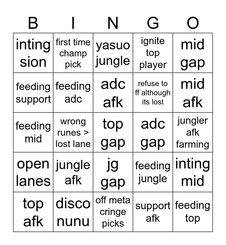 This bingo card has a free space and 25 words: top afk, jungle afk, adc afk, support afk, mid afk, inting sion, first time champ pick, yasuo jungle, refuse to ff although its lost, inting mid, feeding mid, feeding adc, feeding jungle, feeding top, feeding support, disco nunu, off meta cringe picks, ignite top player, jungler afk farming, open lanes, wrong runes > lost lane, jg gap, adc gap, mid gap and test.