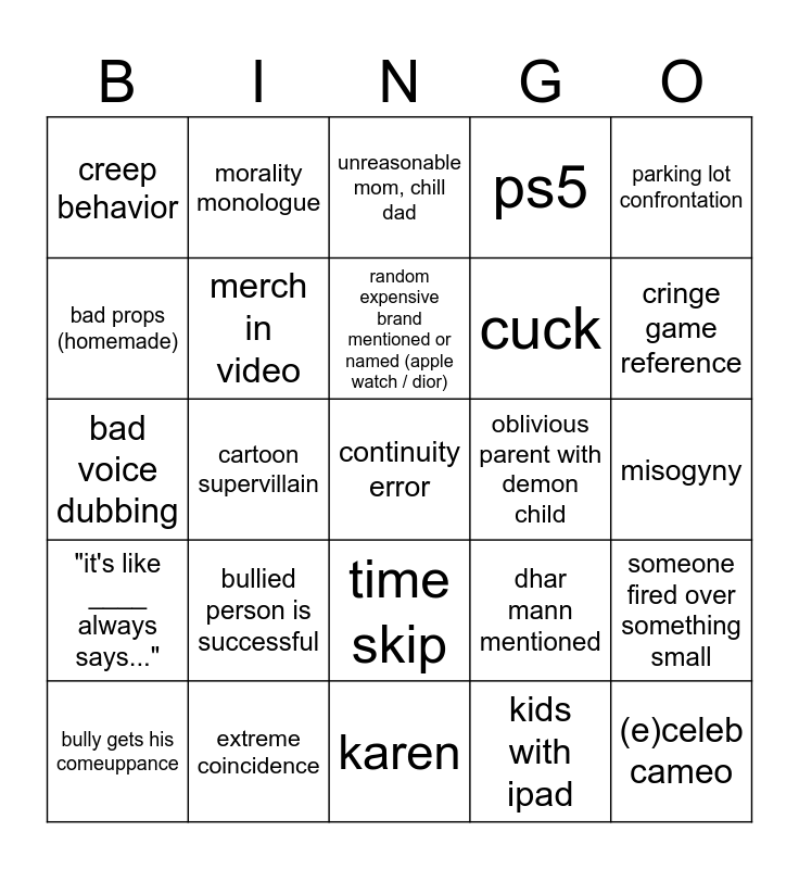 This bingo card has 35 words: dhar mann voiceover, successful nerd, "you see" / "so you see", merch in video, time skip, ps5, bad props (homemade), flashback, random expensive brand mentioned or named (apple watch / dior), dhar mann studios office in the video, bad voice dubbing, parking lot confrontation, Instantly regrets it [FREE SPACE], trauma dump, creep behavior, oblivious parent with demon child, kids with ipad, cartoon supervillain, "it's like ____ always says...", continuity error, dhar mann mentioned, bully gets his comeuppance, someone fired over something small, extreme coincidence, unreasonable mom, chill dad, cringe game reference, (e)celeb cameo, bully redemption arc, cuck, misogyny, racism, karen, bullied person is successful, morality monologue and poor shaming.