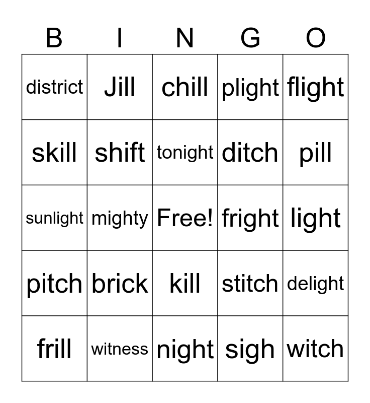 This bingo card has a free space and 24 words: brick, witness, tonight, frill, flight, district, skill, Jill, fright, kill, ditch, sunlight, stitch, delight, shift, sigh, light, chill, pill, mighty, witch, pitch, plight and night.