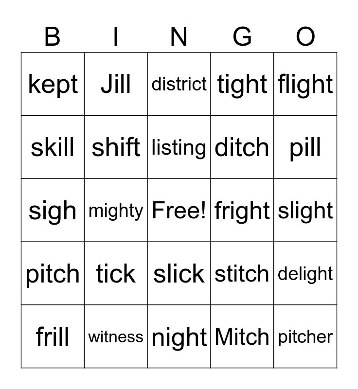 This bingo card has a free space and 24 words: tick, witness, listing, frill, flight, kept, skill, Jill, fright, slick, ditch, sigh, stitch, delight, shift, Mitch, slight, district, pill, mighty, pitcher, pitch, tight and night.