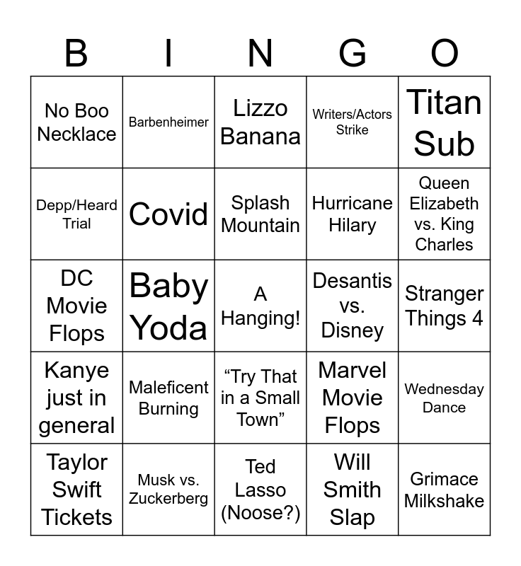 This bingo card has a free space and 24 words: Maleficent Burning, Musk vs. Zuckerberg, Splash Mountain, Taylor Swift Tickets, Titan Sub, No Boo Necklace, Depp/Heard Trial, Barbenheimer, Desantis vs. Disney, “Try That in a Small Town”, Hurricane Hilary, DC Movie Flops, Marvel Movie Flops, Wednesday Dance, Covid, Will Smith Slap, Stranger Things 4, Lizzo Banana, Queen Elizabeth vs. King Charles, Baby Yoda, Grimace Milkshake, Kanye just in general, Writers/Actors Strike and Ted Lasso (Noose?).