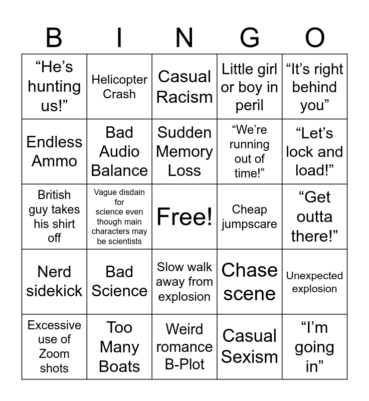 This bingo card has a free space and 24 words: Bad Science, Too Many Boats, Sudden Memory Loss, Excessive use of Zoom shots, “It’s right behind you”, “He’s hunting us!”, Endless Ammo, Helicopter Crash, Cheap jumpscare, Slow walk away from explosion, “We’re running out of time!”, British guy takes his shirt off, Chase scene, Unexpected explosion, Bad Audio Balance, Casual Sexism, “Get outta there!”, Casual Racism, “Let’s lock and load!”, Vague disdain for science even though main characters may be scientists, “I’m going in”, Nerd sidekick, Little girl or boy in peril and Weird romance B-Plot.