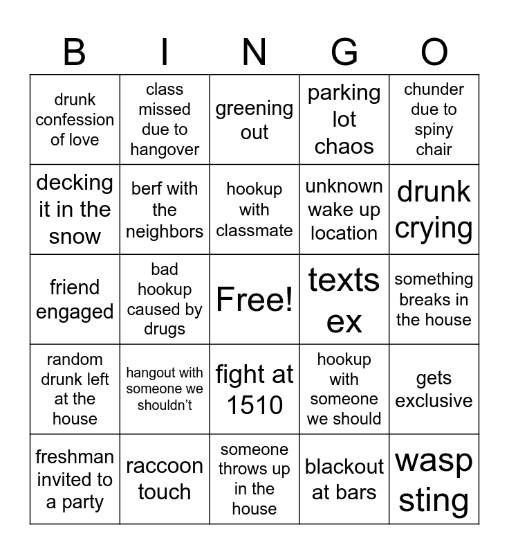 This bingo card has a free space and 24 words: hangout with someone we shouldn’t, raccoon touch, hookup with classmate, freshman invited to a party, chunder due to spiny chair, drunk confession of love, decking it in the snow, class missed due to hangover, texts ex, fight at 1510, unknown wake up location, friend engaged, hookup with someone we should, gets exclusive, berf with the neighbors, blackout at bars, something breaks in the house, greening out, drunk crying, bad hookup caused by drugs, wasp sting, random drunk left at the house, parking lot chaos and someone throws up in the house.