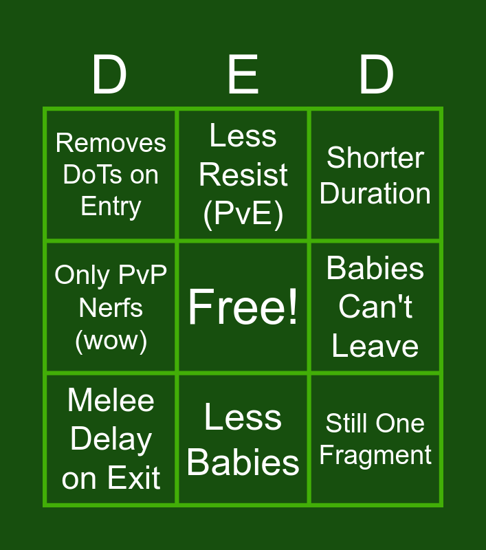 This bingo card has a free space and 8 words: Babies Can't Leave, Shorter Duration, Less Resist (PvE), Melee Delay on Exit, Removes DoTs on Entry, Still One Fragment, Only PvP Nerfs (wow) and Less Babies.