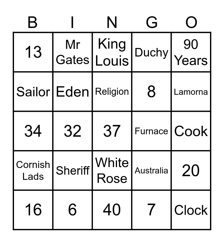 This bingo card has a free space and 60 words: Scillies, 6, Geevor, Cornish Lads, 7, Cape Cornwall, Eden, Carn Brea, 8, Tosher, Duchy, Accent, Sailor, Sally, Razor, 13, Clock, 90 Years, Pedulum, Religion, Furnace, King Louis, 16, 20, John Kanaka, Wreckers, Frisco Bay, 21, Lamorna, Albert Square, 23, River Neet, California, 29, Mr Gates, 30, Winches, 32, Rollicking, 34, John B, Sheriff, Cook, 36, Australia, Cape Horn, 37, Trelawny, 39, White Rose, 40, Little Eyes, 42, Whiskey, Spanish Wine, Rover, 43, 16, 64 and 65.