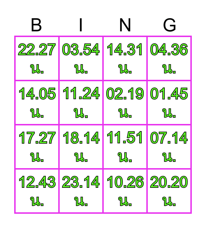 This bingo card has 16 words: 23.14 น., 07.14 น., 14.31 น., 22.27 น., 17.27 น., 03.54 น., 11.51 น., 10.26 น., 14.05 น., 11.24 น., 12.43 น., 04.36 น., 18.14 น., 01.45 น., 02.19 น. and 20.20 น..