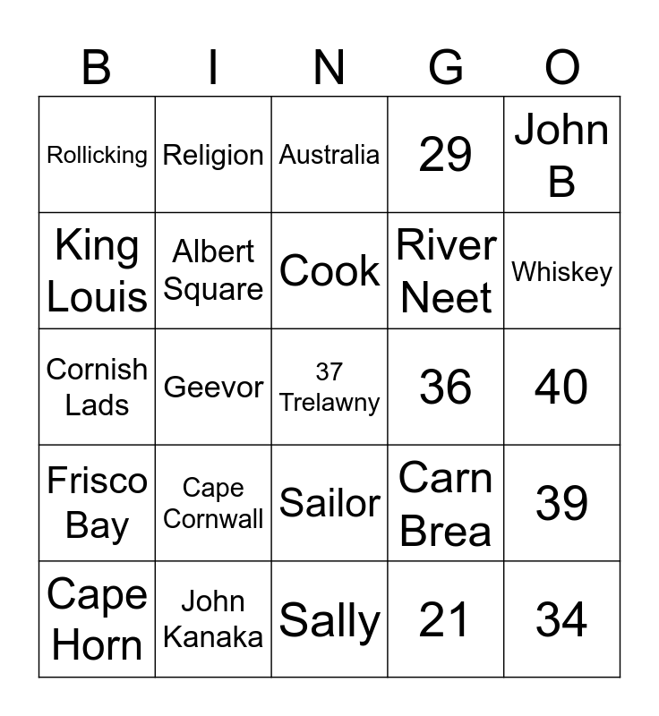 This bingo card has a free space and 58 words: 20, John Kanaka, Wreckers, Frisco Bay, 21, Lamorna, Albert Square, 23, River Neet, California, 29, Mr Gates, 30, Winches, 32, Rollicking, 34, John B, Sheriff, Cook, 36, Australia, Cape Horn, 39, White Rose, 40, Little Eyes, 42, Whiskey, Spanish Wine, Rover, 43, 16, 64, 65, Scillies, 6, Geevor, Cornish Lads, 7, Cape Cornwall, Eden, Carn Brea, 8, Tosher, Duchy, Accent, Sailor, Sally, Razor, 13, Clock, 90 Years, Pendulum, Religion, Furnace, King Louis and 16.
