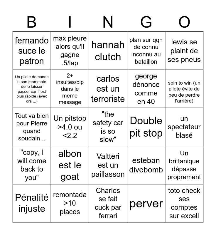 This bingo card has 25 words: albon est le goat, Charles se fait cuck par ferrari, carlos est un terroriste, Pénalité injuste, lewis se plaint de ses pneus, fernando suce le patron, Un pilote demande a son teammate de le laisser passer car il est plus rapide (avec drs ...), max pleure alors qu'il gagne .5/lap, Double pit stop, Valtteri est un paillasson, george dénonce comme en 40, Tout va bien pour Pierre quand soudain..., esteban divebomb, Un brittanique dépasse proprement, 2+ insultes/bip dans le meme message, toto check ses comptes sur excell, un spectateur blasé, hannah clutch, spin to win (un pilote évite de peu de perdre l'arrière), Un pitstop >4.0 ou <2.2, "the safety car is so slow", remontada >10 places, "copy, I will come back to you", plan sur qqn de connu inconnu au bataillon and perver.