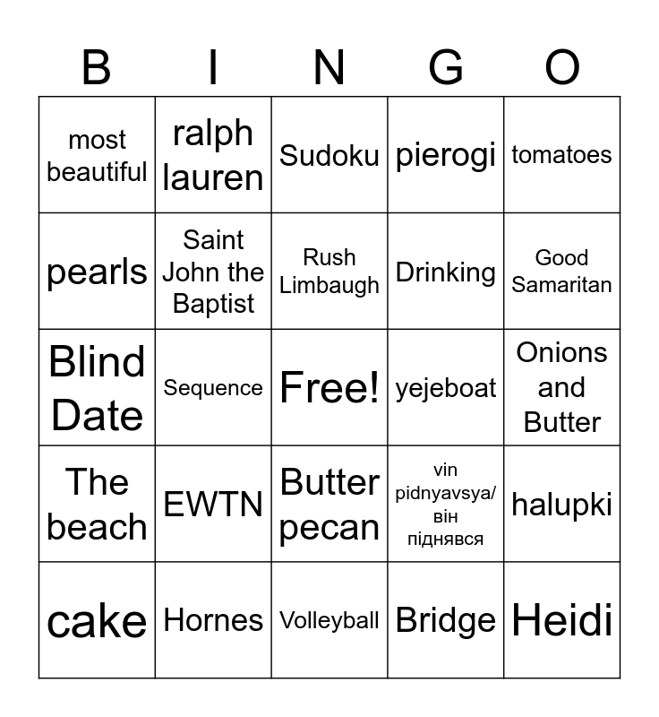 This bingo card has a free space and 48 words: Geranium, Heidi, Butter Pecan, Volleyball, EWTN, none, ralph lauren, beads, pearls, Stowe, Saint John the Baptist, pierogi, halupki, vin pidnyavsya/ він піднявся, Hospody pomyluy/ Господи помилуй, poppyseed, Rush Limbaugh, yejeboat, shchaslyvoho Velykodnya/ щасливого Великодня, tomatoes, Sequence, Bridge, most beautiful, Drinking, Dance, Good Samaritan, cake, Getting to know all about you, Butter pecan, The beach, Armstrong Flooring Company, Preston, Ambridge, Dmytro and Pelagia, Hornes, Mrs. Augustine, stain, Onions and Butter, "troshky/, трошки", teal, coral, greens and pinks, puzzle, Sudoku, November 3, Blind Date, September 4, piano and Niagra Falls.