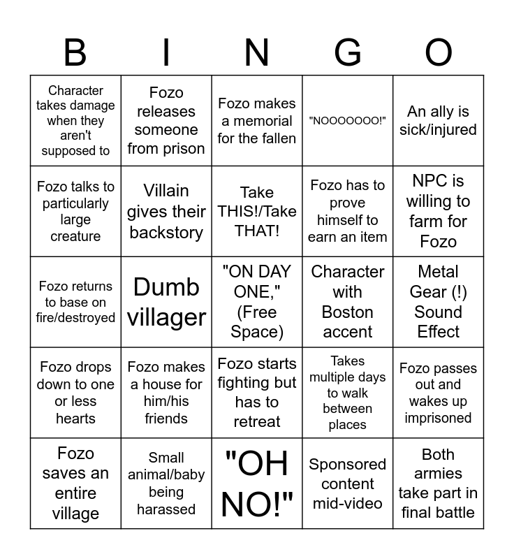 This bingo card has a free space and 31 words: "OH NO!", Family member permadeath at start of video, Dumb villager, Uses model inspired by/from a copyrighted series, Character takes damage when they aren't supposed to, Fozo makes a memorial for the fallen, Villain gives their backstory, Takes multiple days to walk between places, Character with Boston accent, Sponsored content mid-video, Metal Gear (!) Sound Effect, Both armies take part in final battle, NPC villains having banter with each other, Friend sacrifices themselves for Fozo, NPC is willing to farm for Fozo, Fozo reverses a curse, Fozo passes out and wakes up imprisoned, Fozo makes a house for him/his friends, Fozo drops down to one or less hearts, Fozo starts fighting but has to retreat, An ally is sick/injured, Fozo gets caught stealing, Fozo saves an entire village, Fozo releases someone from prison, Fozo has to prove himself to earn an item, Fozo talks to particularly large creature, "NOOOOOOO!", Fozo returns to base on fire/destroyed, Small animal/baby being harassed, Take THIS!/Take THAT! and "down for the count".