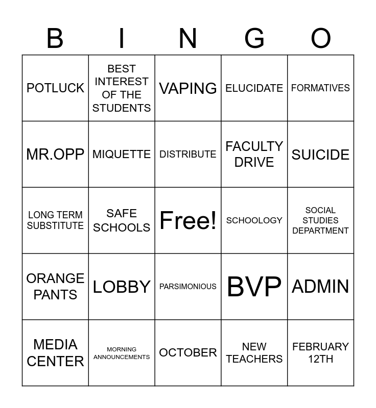 This bingo card has a free space and 54 words: DECK, ORANGE PANTS, ORIOLES, MY SON(S), PARSIMONIOUS, BOONDOGGLE, ELUCIDATE, PLUCHRITUDINOUS, MR.OPP, FACULTY DRIVE, POTLUCK, THE GYM, MORNING ANNOUNCEMENTS, MEDIA CENTER, TEACHER OF THE YEAR, OCTOBER, FEBRUARY 12TH, FACULTY DRIVE, THURSDAY, SOCIAL STUDIES DEPARTMENT, BVP, COUNTY MEETINGS, SCHOOLOGY, FORMATIVES, SCHEDULE CHANGES, BEST INTEREST OF THE STUDENTS, PARAS, SMART PASSES, STUDENT AIDES, NEW TEACHERS, CCCTA, PROFESSIONAL LEARNING COMMUNITIES, FAMILIES, CLASS MEETINGS, VAPING, IEP, LONG TERM SUBSTITUTE, ADMIN, LAPTOPS, MIQUETTE, PRESENTATION, POLITICAL DISCOURSE, MR. STICKLER, BATHROOM DUTY, LOBBY, INCLEMENT WEATHER, OBSERVATIONS, FINAL EXAMS, DISTRIBUTE, SAFE SCHOOLS, SUICIDE, RUBBER GLOVES, OFFICE REFERRAL and INTERIM.