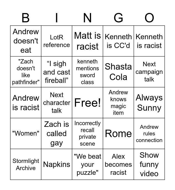 This bingo card has a free space and 54 words: Matt watches sports, "Women", "I swear I'm a good guy", Rule Debate, Incorrectly recall private scene, Is Alex tired?, Kenneth is CC'd, Jacob antics are mentioned, "Zach doesn't like pathfinder", trash talk 5e, Andrew doesn't eat, Don't talk about school, Napkins, Stormlight Archive, Brandon Sanderson, "We beat your puzzle", Show funny video, Shasta Cola, Big Bean Burrito, Always Sunny, Rome, Kenneth does italian accent, Andrew knows magic item, Kenneth is racist, Zach says he has fun, LotR reference, Wheel of Time, “Sportsball”, Baldur’s Gate 3, Alex becomes racist, Someone drops dice, Veto system mentioned, Matt makes dad joke, Zach is racist, Matt is racist, Kenneth tends plants, Andrew is racist, Andrew rules connection, Players misremember last session, “I sigh and cast fireball”, Taps, Zach likes horses, Mistborn, Cinema discussion, Zach is called gay, Andrew Garglannon Richards, Chipotle rewards redeemed, “shotgun”, kenneth mentions sword class, Next character talk, Next campaign talk, Pathfinder Shopping, Sevra is hard countered and Meta game the spell is said.
