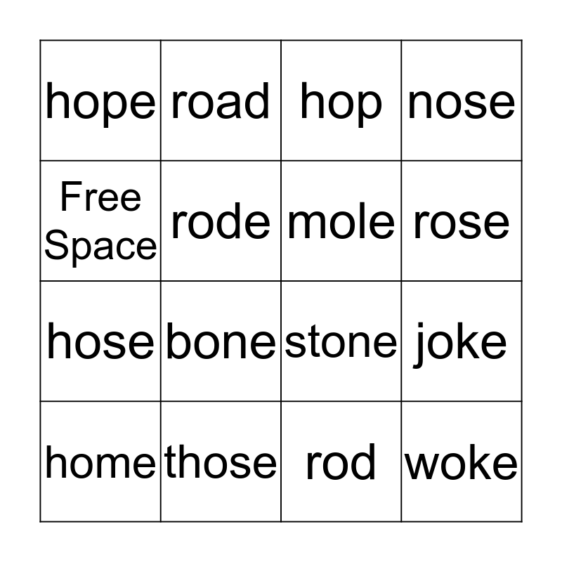 This bingo card has a free space and 15 words: home, woke, hop, hope, rose, Free Space, bone, rod, rode, hose, joke, nose, mole, road and those.