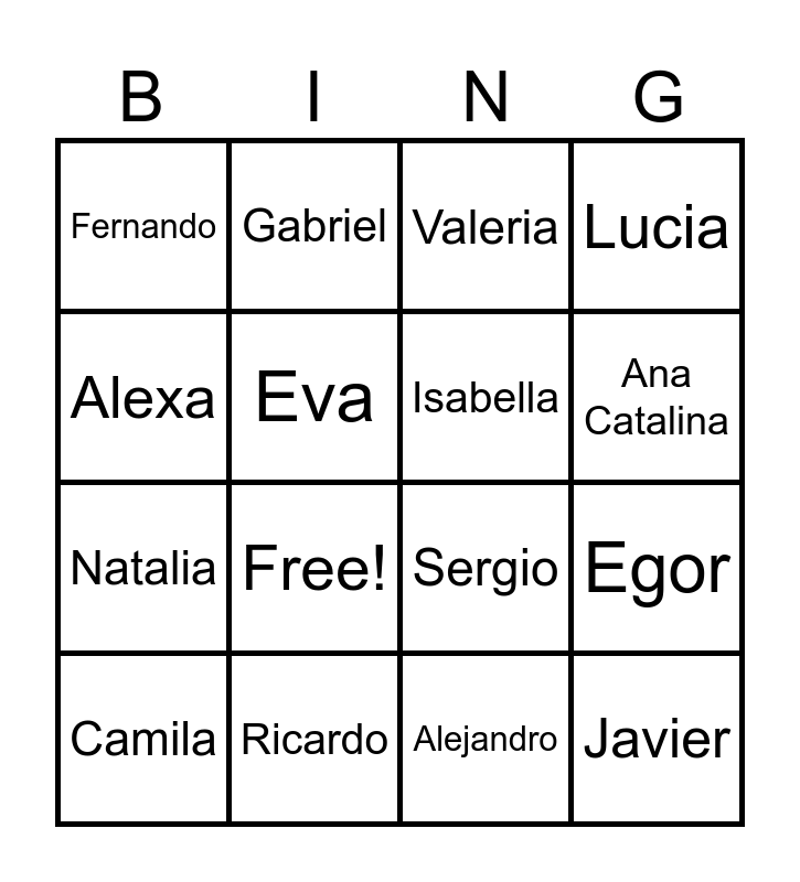 This bingo card has 18 words: Free!, Javier, Valeria, Fernando, Sergio, Lucia, Camila, Gabriel, Ana Catalina, Natalia, Alejandro, Alexa, Egor, Eva, Isabella, Fernanda, Ricardo and -.