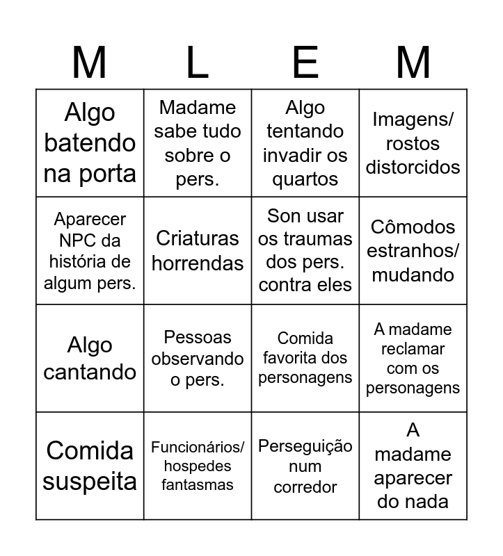 This bingo card has 40 words: Roupas extras, Comida favorita dos personagens, Alguém ficar em morrendo, Son usar os traumas dos pers. contra eles, Alguém quebrar as regras, Portas estranhas/ aparecendo do nada, Cômodos estranhos/ mudando, Personagem se sentir observado, Aparecer NPC da história de algum pers., A madame aparecer do nada, A madame reclamar com os personagens, Imagens/ rostos distorcidos, Comida suspeita, Perseguição num corredor, Funcionários/ hospedes fantasmas, Barulhos e/ou gritos esquisitos, Sonho ultra realista, Algo batendo na porta, Skinwalker substituindo algum pers., Algo tentando invadir os quartos, Seita acontecendo, Pers. sendo sequestrado/ sumir, Algo cantando, Criaturas horrendas, Algo nas paredes., Algo pingando no pers., Passado do personagem, Madame se tornando uma criatura, Choro vindo do nada, Pers. não querendo sair mais da casa, Objetos sumindo/ aparecendo do nada, Objetos dos pers. sumindo, Tempo estranho/ horas não passam, Pers. se apegando a algum bicho, Pessoas observando o pers., Funcionários/ hospedes ignorando os pers., Zerar sanidade, Pequeno/ grande incêndio, Madame sabe tudo sobre o pers. and Madame prende eles na casa.