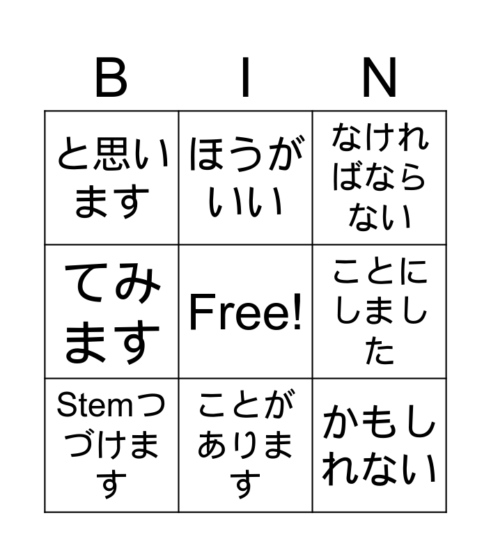 This bingo card has a free space and 8 words: ことにしました, なければならない, ほうがいい, Stemつづけます, と思います, かもしれない, てみます and ことがあります.