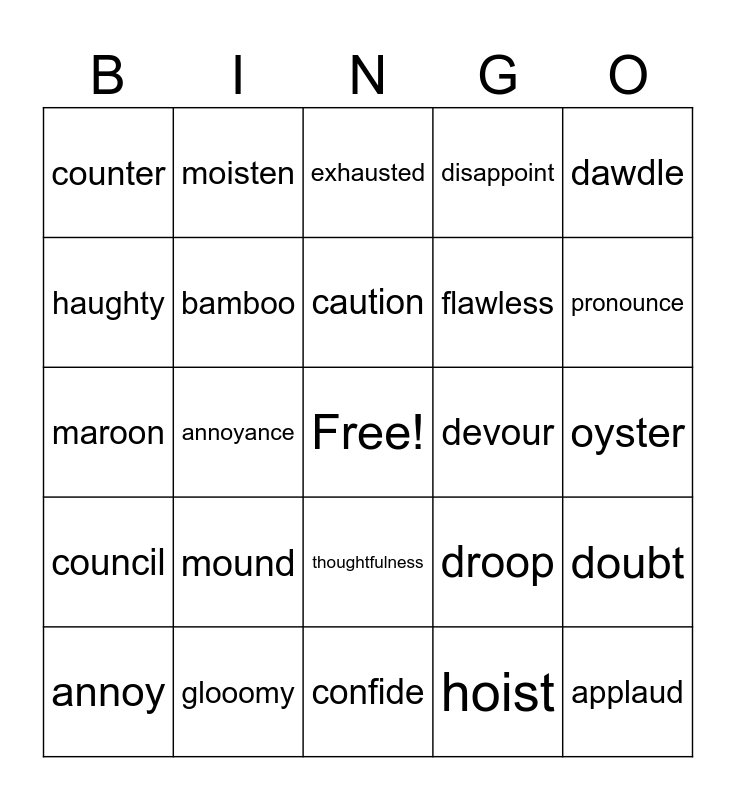 This bingo card has a free space and 24 words: mound, glooomy, caution, annoy, dawdle, counter, haughty, moisten, devour, thoughtfulness, flawless, maroon, droop, doubt, bamboo, hoist, oyster, exhausted, pronounce, annoyance, applaud, council, disappoint and confide.