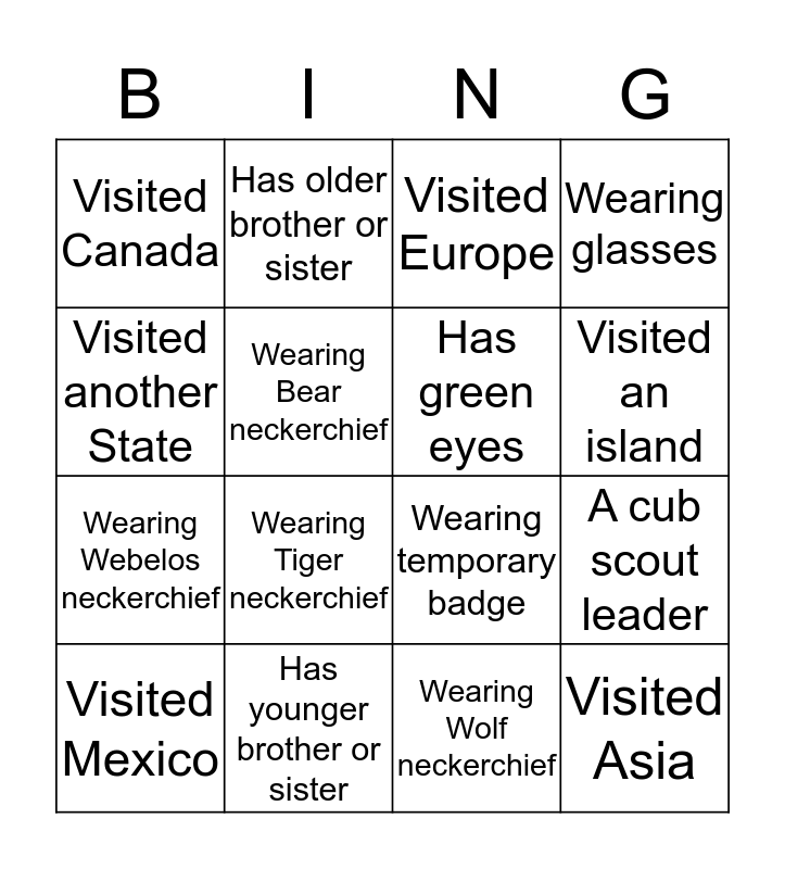 This bingo card has a free space and 15 words: Visited Mexico, Visited Asia, Visited Europe, Visited Canada, Visited an island, Visited another State, Wearing Tiger neckerchief, Wearing Wolf neckerchief, Wearing Bear neckerchief, Wearing Webelos neckerchief, A cub scout leader, Wearing glasses, Has green eyes, Has older brother or sister and Has younger brother or sister.