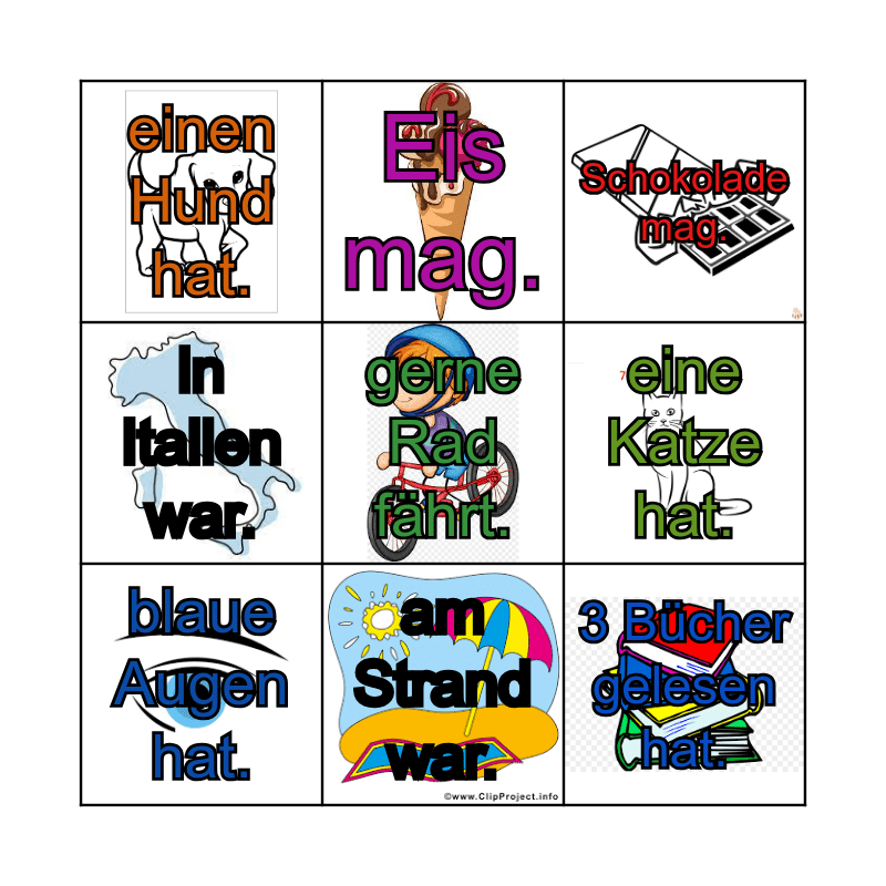 This bingo card has 8 images, a free space and 8 words: eine Katze hat., Schokolade mag., Eis mag., blaue Augen hat., einen Hund hat., 3 Bücher gelesen hat., in Italien war. and am Strand war..