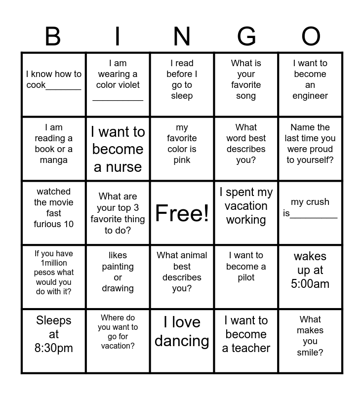 This bingo card has a free space and 24 words: Sleeps at 8:30pm, likes painting or drawing, my favorite color is pink, I want to become a teacher, I want to become an engineer, I know how to cook_______, I am wearing a color violet __________, I read before I go to sleep, I spent my vacation working, my crush is_________, watched the movie fast furious 10, I want to become a nurse, I want to become a pilot, wakes up at 5:00am, I am reading a book or a manga, Where do you want to go for vacation?, I love dancing, What is your favorite song, Name the last time you were proud to yourself?, If you have 1million pesos what would you do with it?, What are your top 3 favorite thing to do?, What animal best describes you?, What word best describes you? and What makes you smile?.