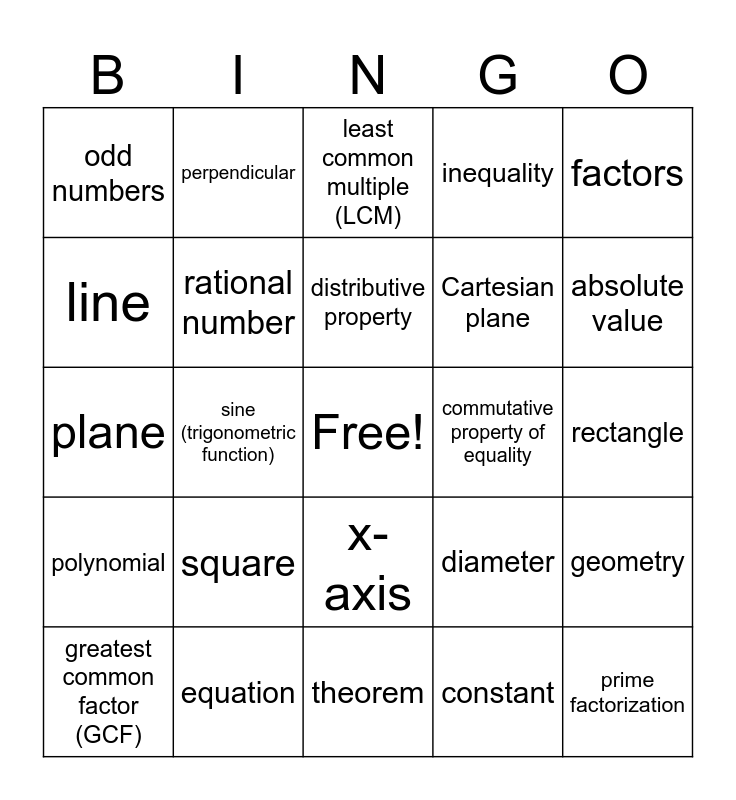 This bingo card has a free space and 60 words: algebra, equation, variable, polynomial, constant, exponent, rational number, integer, Cartesian plane, binomial, inequality, prime number, line, composite numbers, even numbers, odd numbers, prime factorization, factors, quotient, distributive property, commutative property of equality, least common multiple (LCM), greatest common factor (GCF), geometry, angle, terminal side, obtuse angle, trigonometry, absolute value, reflex angle, circle, perimeter, area, parallel lines, perpendicular, circumference, isosceles triangle, sine (trigonometric function), vertex, plane, point, square, rectangle, triangle, diameter, radius, Pythagorean theorem, x-intercept, right triangle, x-axis, theorem, point of origin, quadrants, slope, transversal line, supplementary angles, complementary angles, parabola, line segment and ray.