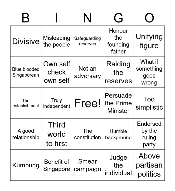This bingo card has a free space and 24 words: Third world to first, Benefit of Singapore, Not an adversary, Kumpung, Unifying figure, Divisive, Blue blooded Singaporean, Misleading the people, Persuade the Prime Minister, The constitution, Raiding the reserves, The establishment, Humble background, Endorsed by the ruling party, Own self check own self, Judge the individual, Too simplistic, Safeguarding reserves, What if something goes wrong, Truly independent, Above partisan politics, A good relationship, Honour the founding father and Smear campaign.