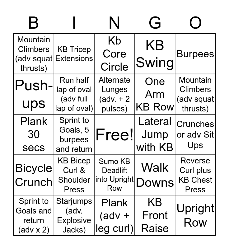 This bingo card has a free space and 24 words: KB Bicep Curl & Shoulder Press, Starjumps (adv. Explosive Jacks), Alternate Lunges (adv. + 2 pulses), Sprint to Goals and return (adv x 2), Burpees, Mountain Climbers (adv squat thrusts), Push-ups, KB Tricep Extensions, Lateral Jump with KB, Sumo KB Deadlift into Upright Row, One Arm KB Row, Plank 30 secs, Walk Downs, Reverse Curl plus KB Chest Press, Run half lap of oval (adv full lap of oval), KB Front Raise, Crunches or adv Sit Ups, Kb Core Circle, Mountain Climbers (adv squat thrusts), Sprint to Goals, 5 burpees and return, Upright Row, Bicycle Crunch, KB Swing and Plank (adv + leg curl).