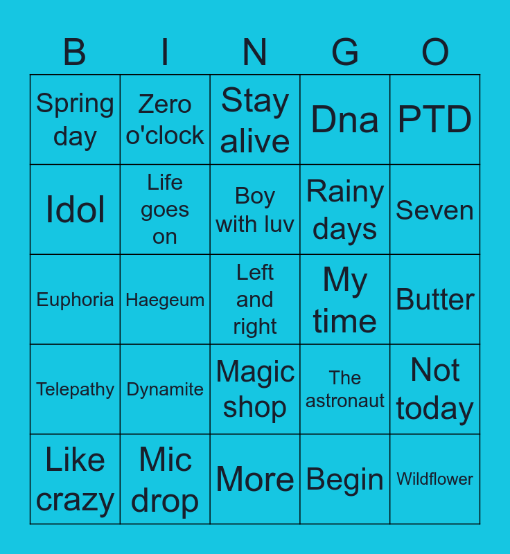 This bingo card has a free space and 24 words: Dynamite, Mic drop, Boy with luv, Like crazy, PTD, Spring day, Idol, Zero o'clock, My time, Magic shop, Rainy days, Euphoria, The astronaut, Not today, Life goes on, Begin, Butter, Stay alive, Seven, Haegeum, Wildflower, Telepathy, Dna and More.