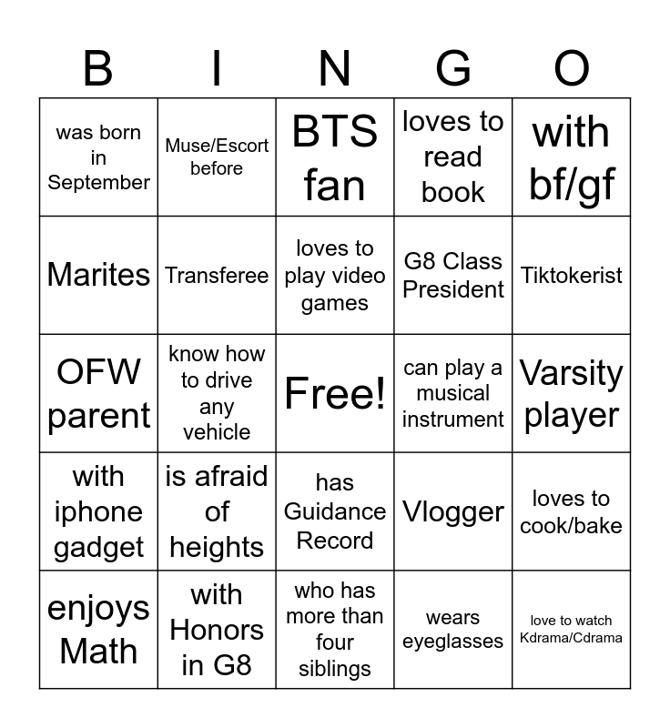 This bingo card has a free space and 29 words: enjoys Math, is left-handed, know how to drive any vehicle, G8 Class Monitor, was born in September, BTS fan, Transferee, is afraid of heights, can play a musical instrument, with Honors in G8, Varsity player, love to watch Kdrama/Cdrama, who has more than four siblings, wears eyeglasses, Tiktokerist, has siblings in other grade level, has Guidance Record, with iphone gadget, with bf/gf, OFW parent, Vlogger, is an only child, G8 Class President, Marites, loves to read book, Muse/Escort before, loves to cook/bake, loves to play video games and has a pet dog.