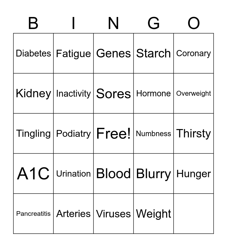 This bingo card has a free space and 24 words: A1C, Arteries, Blood, Blurry, Coronary, Diabetes, Fatigue, Genes, Hormone, Hunger, Kidney, Inactivity, Metabolism, Numbness, Overweight, Pancreatitis, Podiatry, Sores, Starch, Thirsty, Tingling, Urination, Viruses and Weight.