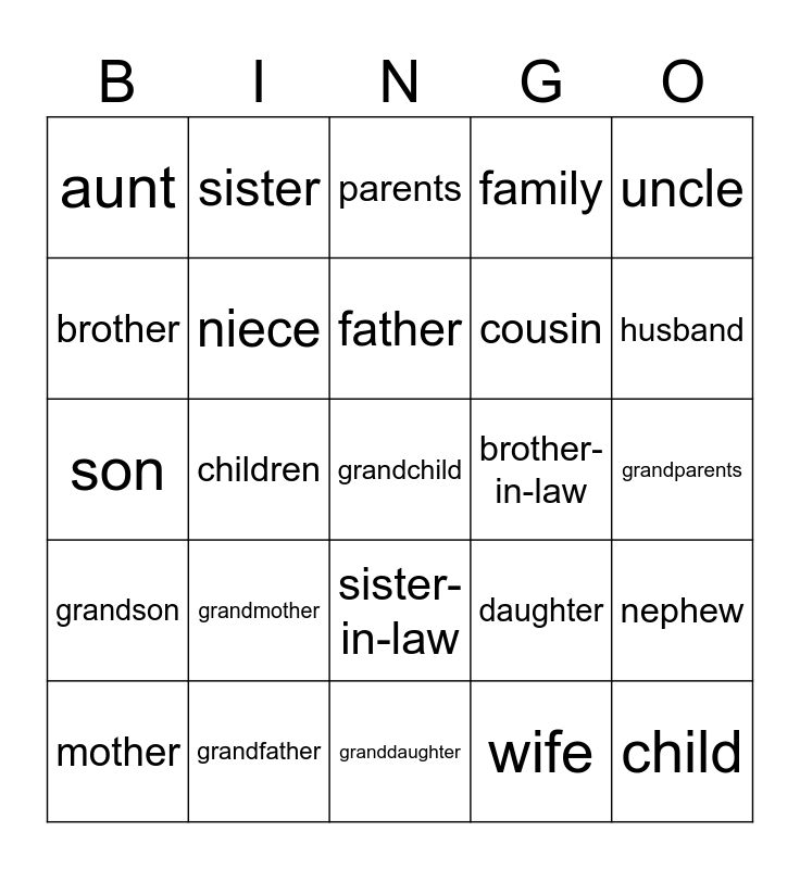 This bingo card has a free space and 24 words: grandmother, grandfather, father, mother, uncle, aunt, brother, sister, brother-in-law, sister-in-law, cousin, son, daughter, nephew, niece, wife, grandparents, parents, husband, children, child, grandson, family and granddaughter.