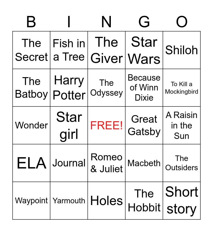This bingo card has a free space and 29 words: Waypoint, Hoot, Star girl, Freedom Writers, The Secret, The Giver, Harry Potter, Journal, Great Gatsby, Yarmouth, A Raisin in the Sun, Short story, Holes, The Hobbit, To Kill a Mockingbird, All four stars, Romeo & Juliet, ELA, Shiloh, Wonder, Macbeth, The Crucible, Because of Winn Dixie, The Batboy, Star Wars, Fish in a Tree, The Outsiders, The Odyssey and The Crossover.