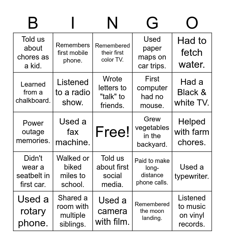 This bingo card has a free space and 24 words: Walked or biked miles to school., Shared a room with multiple siblings., Wrote letters to "talk" to friends., Used a rotary phone., Had to fetch water., Told us about chores as a kid., Learned from a chalkboard., Remembers first mobile phone., Grew vegetables in the backyard., Told us about first social media., First computer had no mouse., Power outage memories., Paid to make long-distance phone calls., Used a typewriter., Listened to a radio show., Remembered the moon landing., Helped with farm chores., Remembered their first color TV., Had a Black & white TV., Used a fax machine., Listened to music on vinyl records., Didn't wear a seatbelt in first car., Used paper maps on car trips. and Used a camera with film..