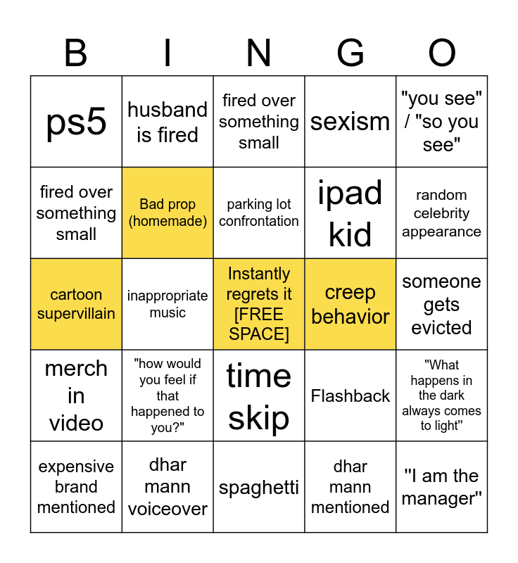 This bingo card has a free space and 24 words: "how would you feel if that happened to you?", dhar mann voiceover, parking lot confrontation, expensive brand mentioned, "you see" / "so you see", ps5, fired over something small, husband is fired, creep behavior, time skip, ipad kid, cartoon supervillain, Flashback, ''What happens in the dark always comes to light'', Bad prop (homemade), dhar mann mentioned, someone gets evicted, fired over something small, random celebrity appearance, inappropriate music, ''I am the manager'', merch in video, sexism and spaghetti.