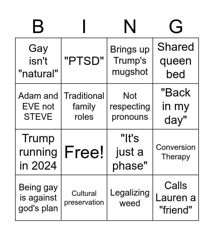 This bingo card has 18 words: Free!, Calls Lauren a "friend", Brings up Trump's mugshot, Gay isn't "natural", "It's just a phase", Shared queen bed, Being gay is against god's plan, "PTSD", "Back in my day", Trump running in 2024, Legalizing weed, Adam and EVE not STEVE, Conversion Therapy, Traditional family roles, Not respecting pronouns, Casual racism, Cultural preservation and Casual xenophobia.